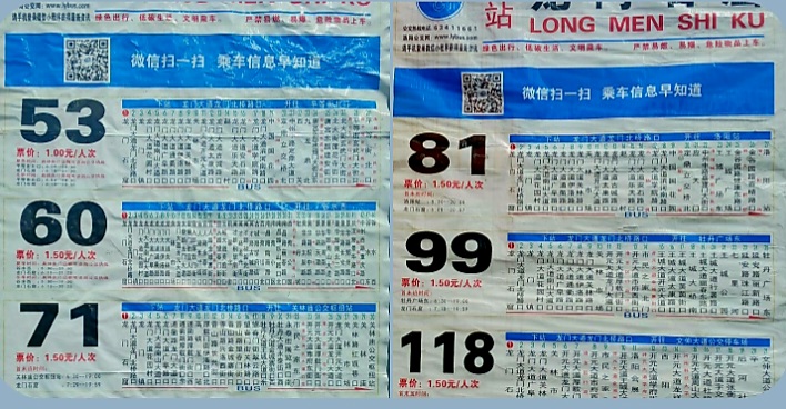 버스는 정저우장도기차점(郑州 长途汽车站)/정저우객운총점 (郑州客运总站)이나 정저우서부 객운점(郑州西部客运站)에서 30~60분 간격으로 출발하여 뤼양객운총점(洛阳客运总站까지 1시간30분정도 소요되고 요금은 4~50위안입니다.