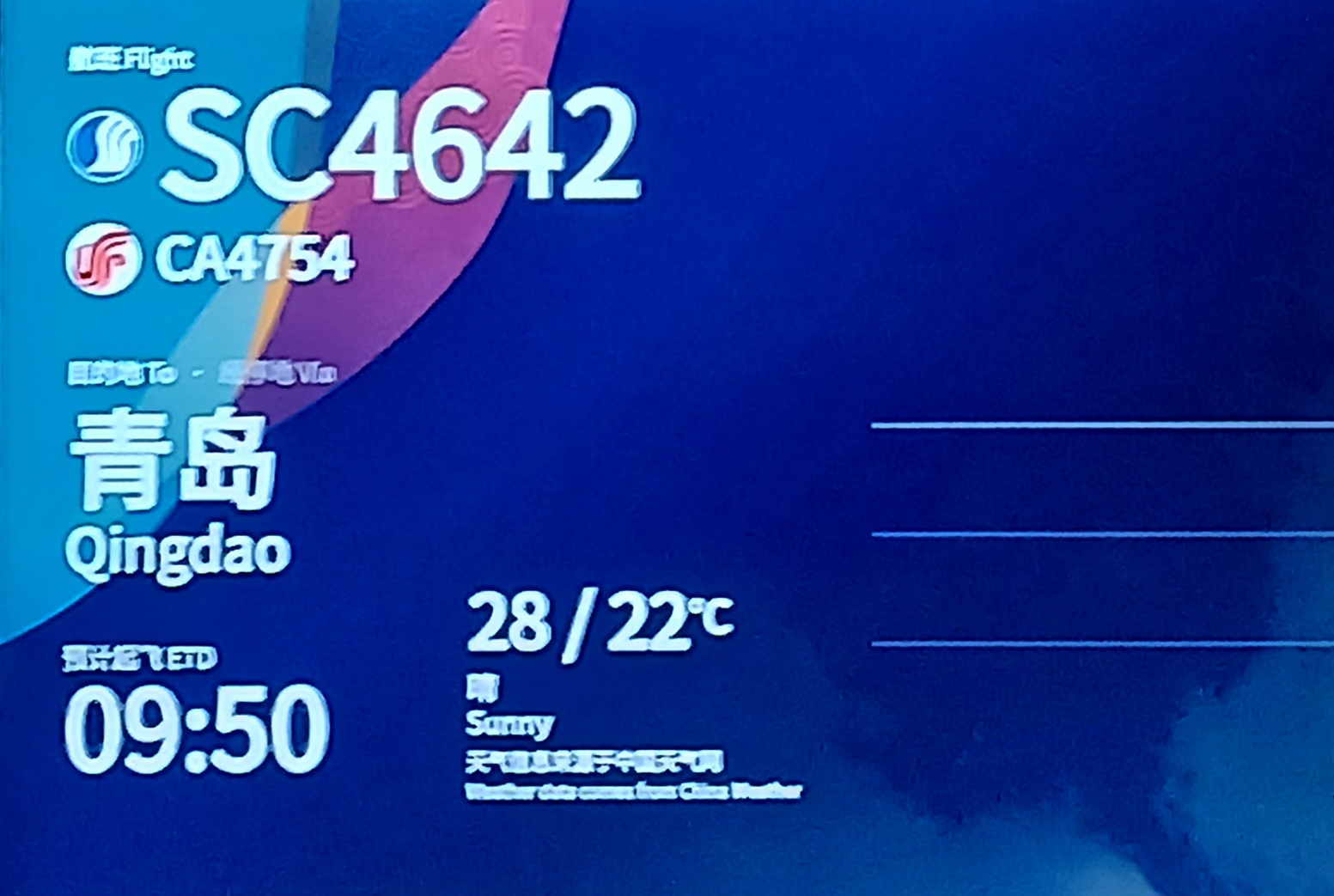 오전9시50분 베이징서우두국제 공항(PEK)을 이륙한 산둥항공 SC 4642편은 640km를 비행한 후 오전11시20분 칭다오자오둥국제 공항(TAO)에 무사히 착륙하고 환승을 거쳐 오후 12시50분 산둥항공SC4615편 트랩에 오르자 570km를 비행한 후 오후15시 인천국제공항에 무사히 착륙하여 이번 여행 여정의 대미를 장식합니다.