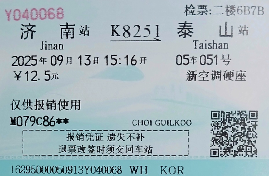 2.인천(仁川)SC8006/820km-> 지난(济南)K8251/70km-> 타이샨(泰山)K1332/70km -> 지난(济南)SC8003/820km-> 인천 (仁川)