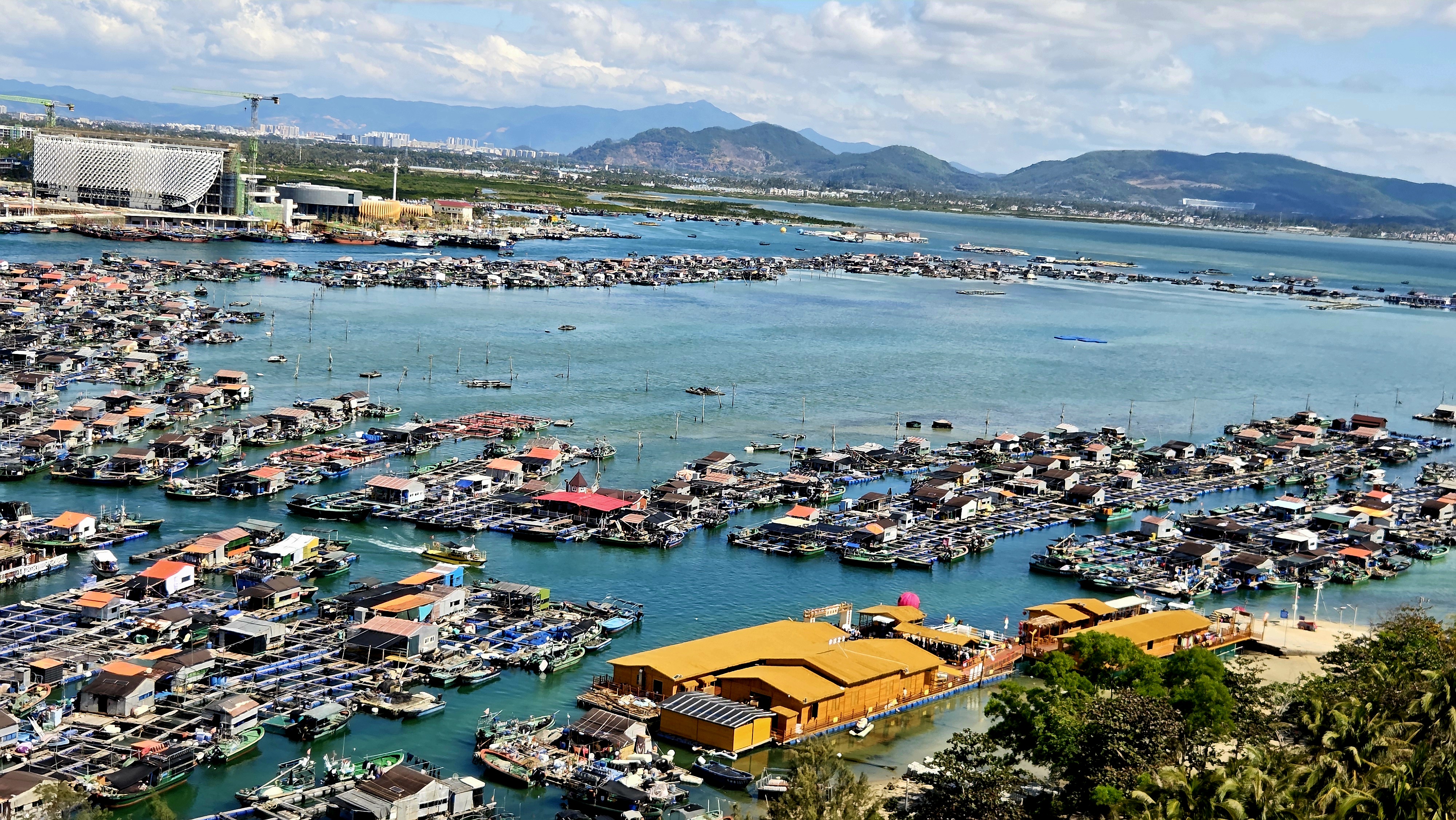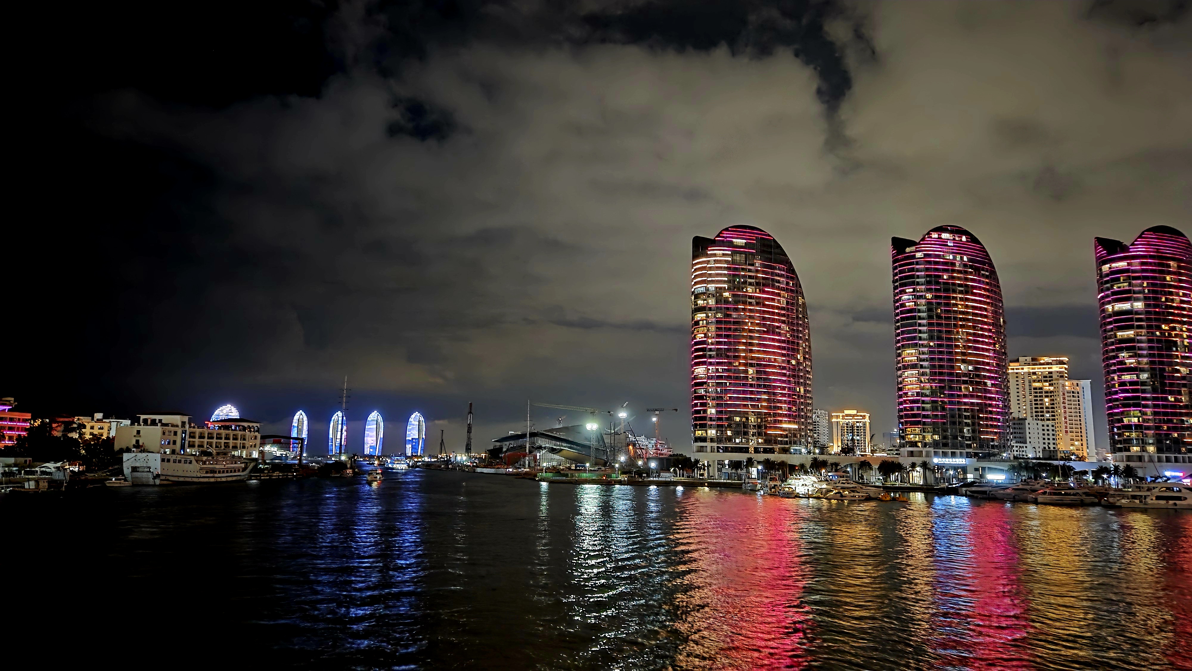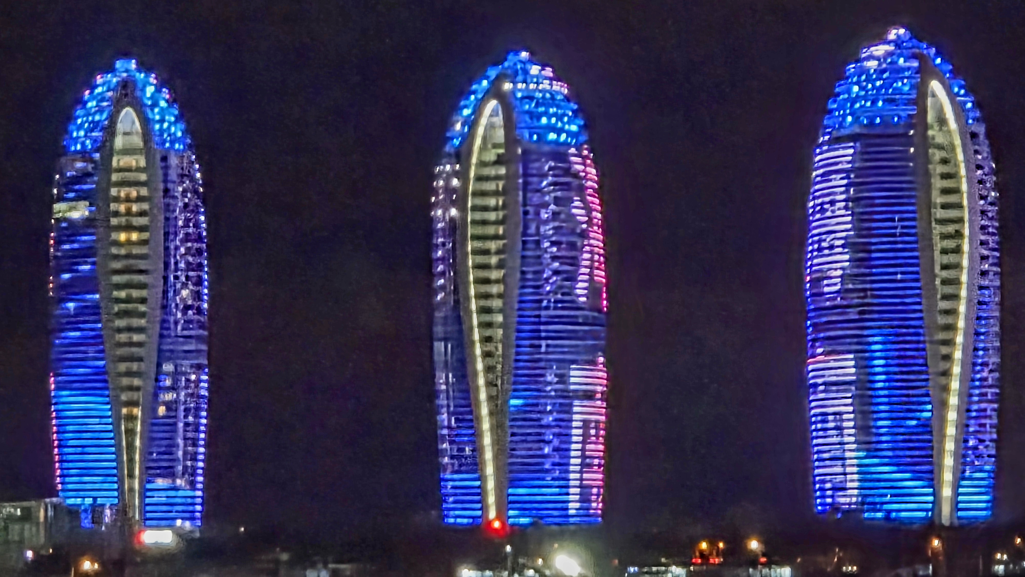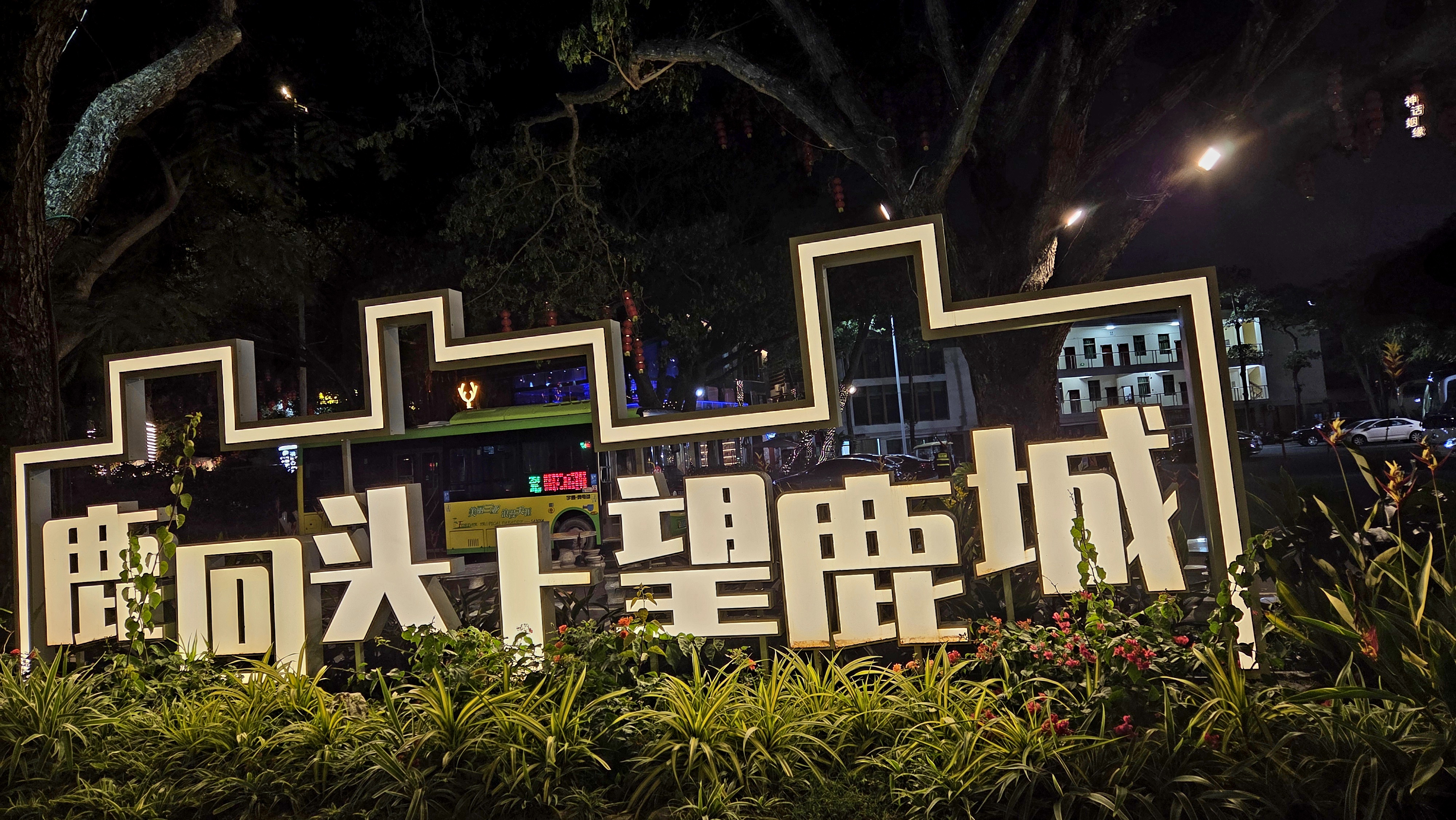 뒤로는 싼야국제요트센터 좌로는 녹회두공원 우로는 싼야만 마천루의 스카이 라인이 앞으로는 봉황도 5개 랜드마크 에서 펼쳐지는 야간 LED 조명 쇼가 펼쳐져 장관을 이룹니다.