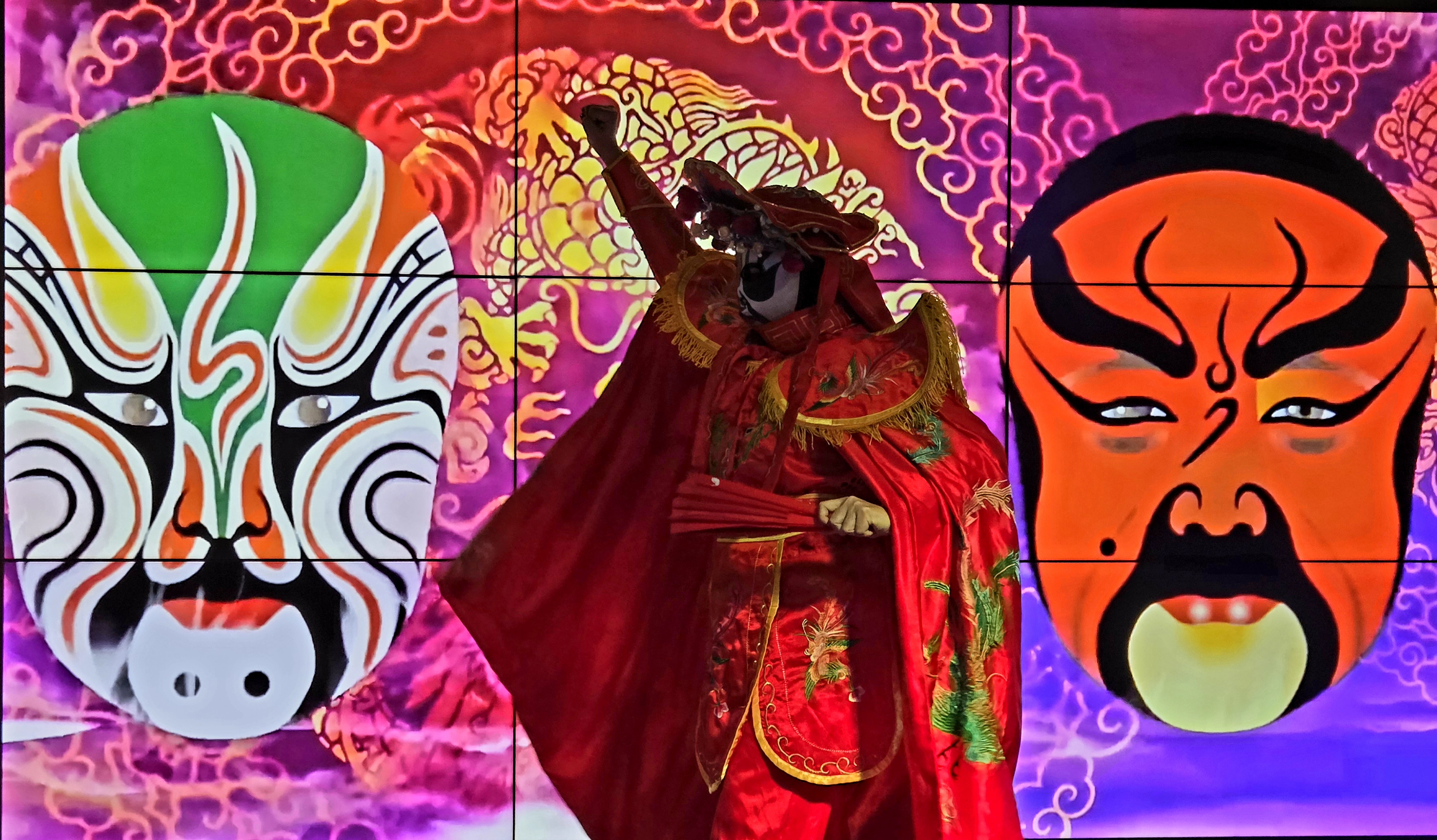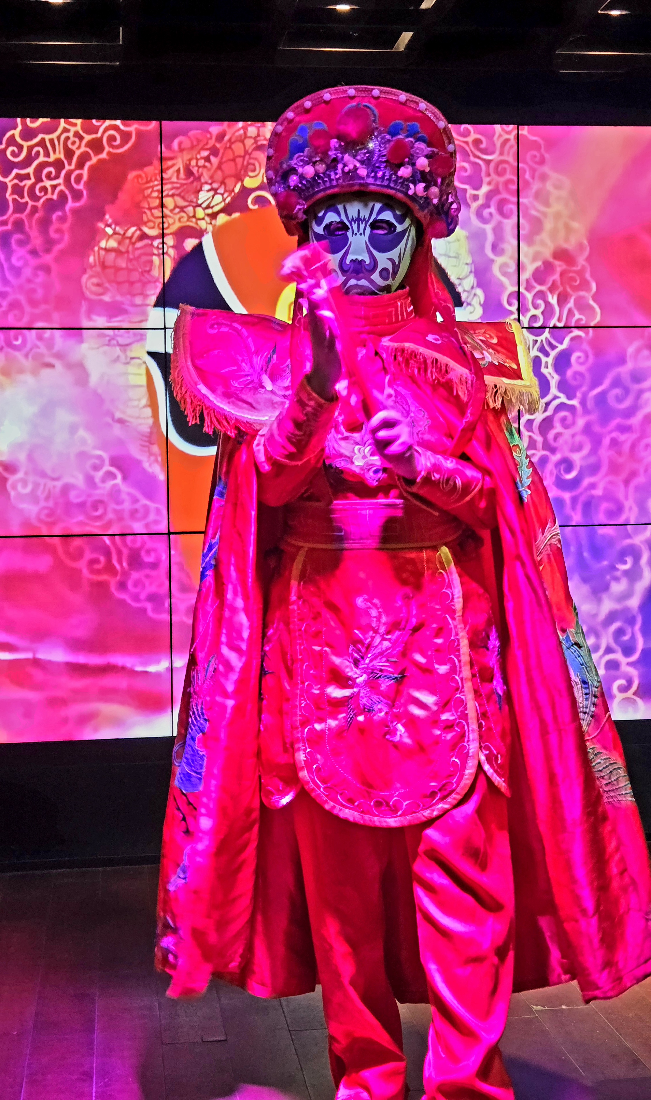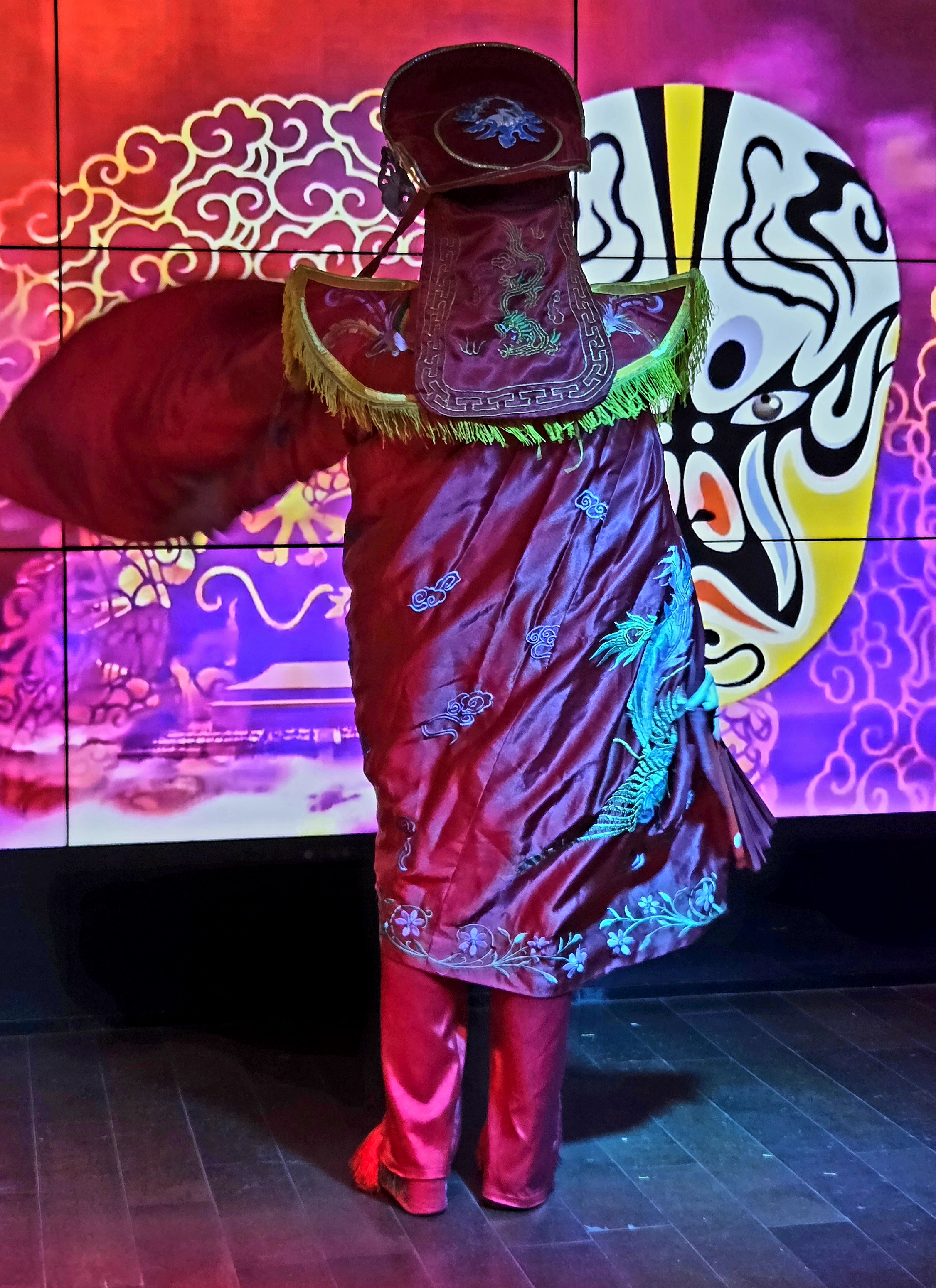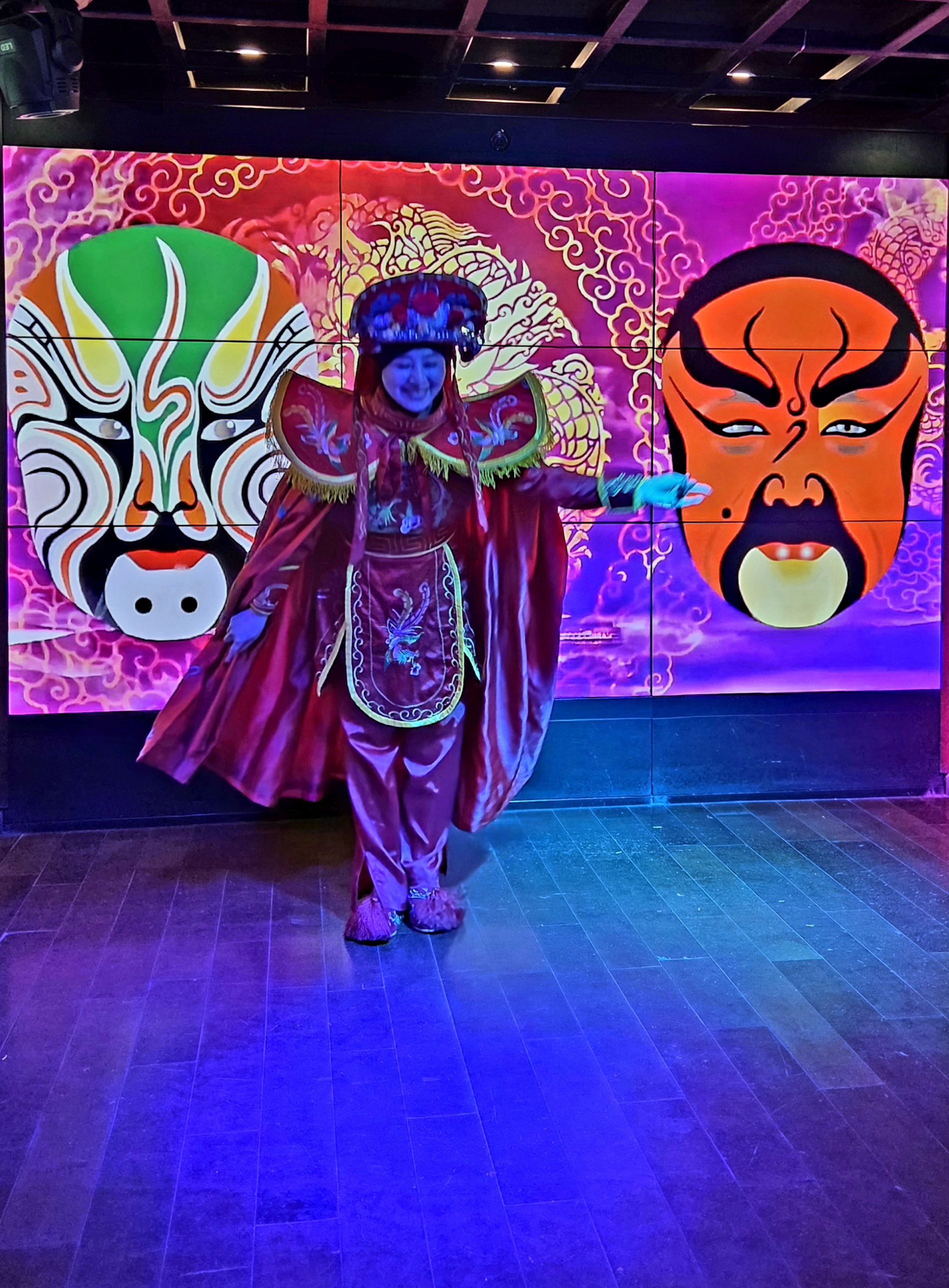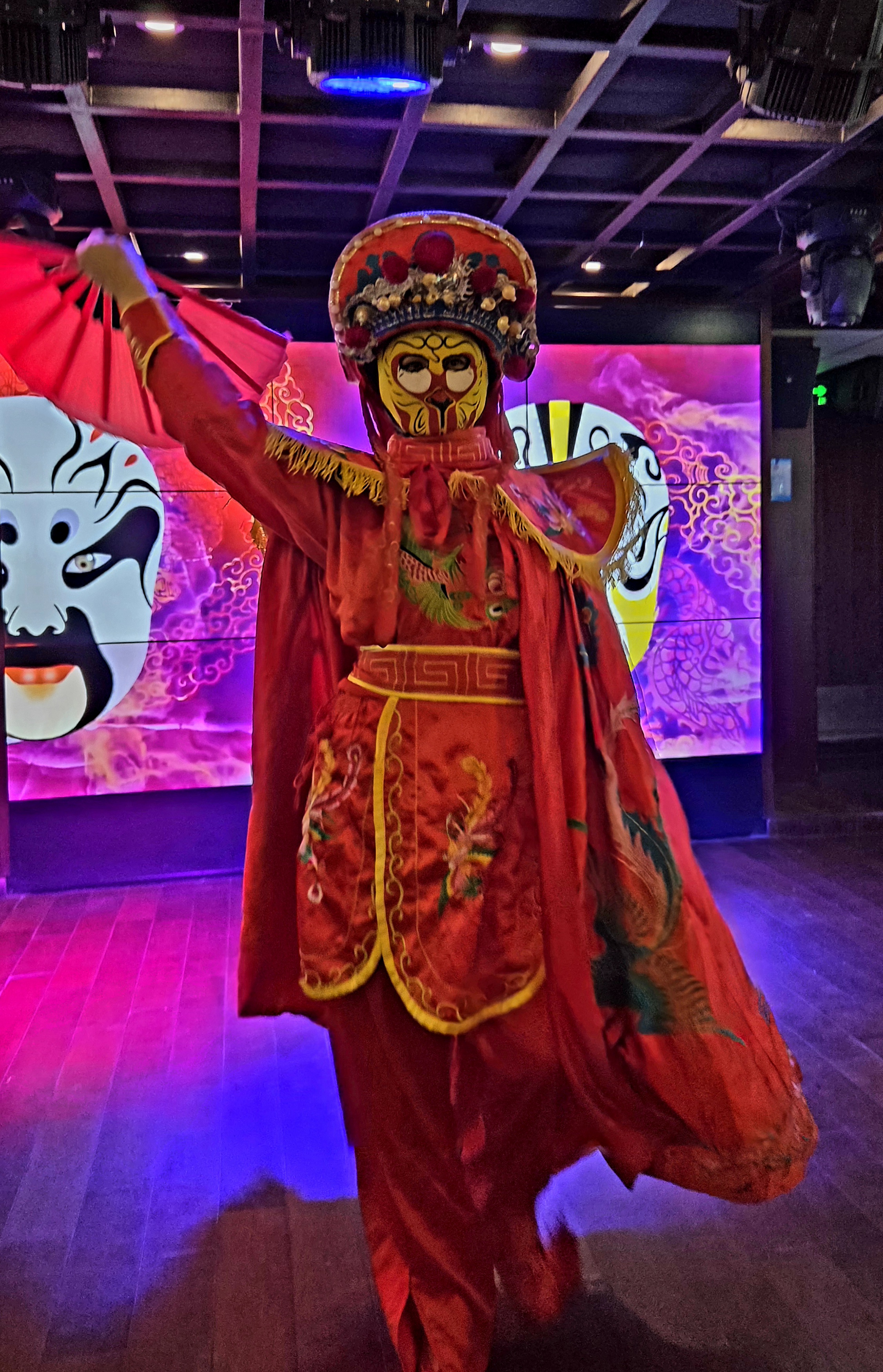 중국의 전통극인 천극(川劇)의 대표적인 공연 기법인 변검 (變臉)공연이 시작됩니다. 변검은 배우가 순식간에 얼굴의 가면을 바꾸는 독특한 기예로 유명한데 화려한 의상을 입고 역동적인 음악에 맞춰 춤을 추며 가면을 바꿉니다.얼굴 분장인 검보(脸谱)도 백개의 얼굴로 시시각각 변하는데 색깔이 다 다릅니다.