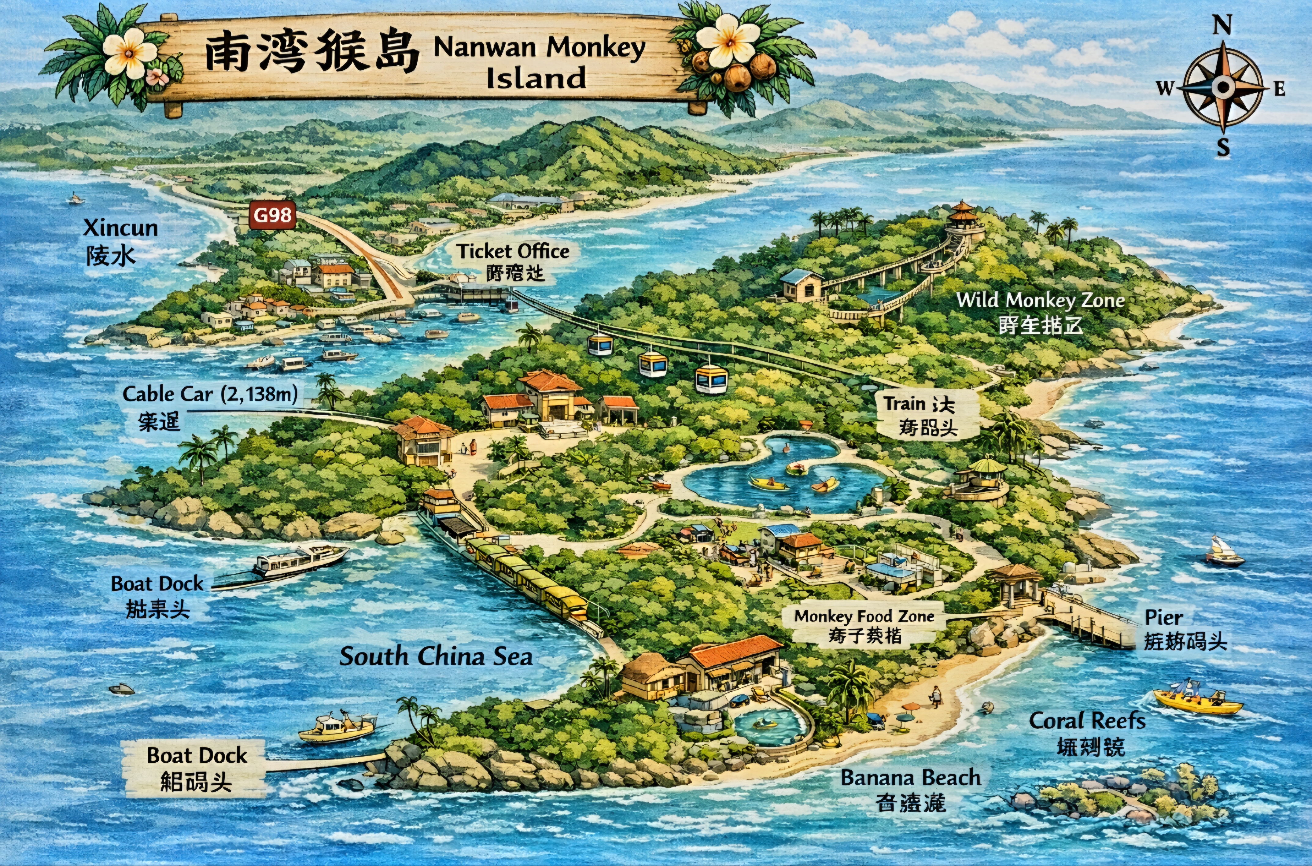 주요 볼거리로는 싼야의 랜드마크인 12m에 달하는 거대한 사슴 동상,연인 테마 조각상,사랑 자물쇠 구역, 전망대(일몰 명소),리족 문화 전시관등이 있는데 밤에는 조명이 켜져 매우 로맨틱합니다.