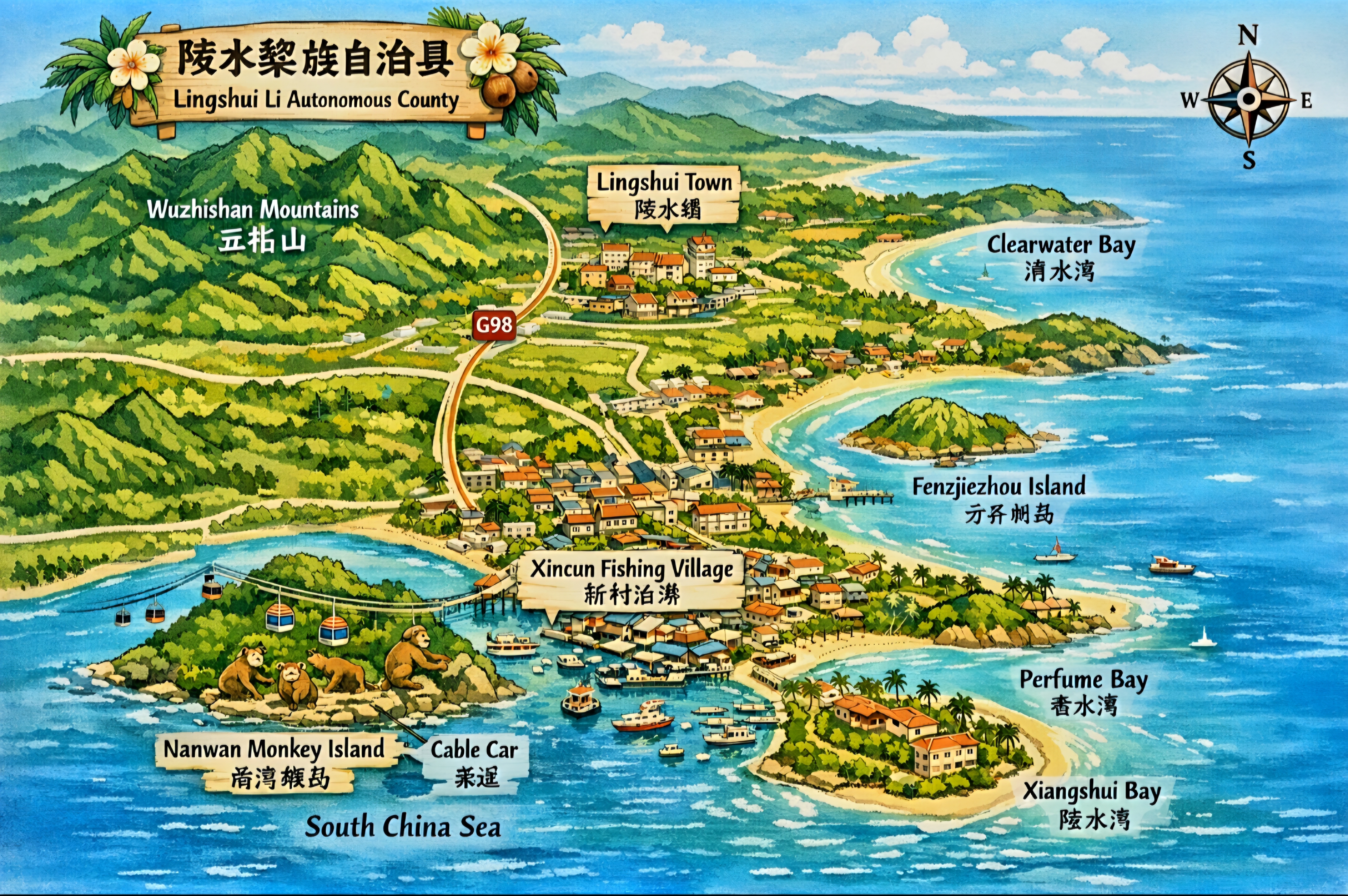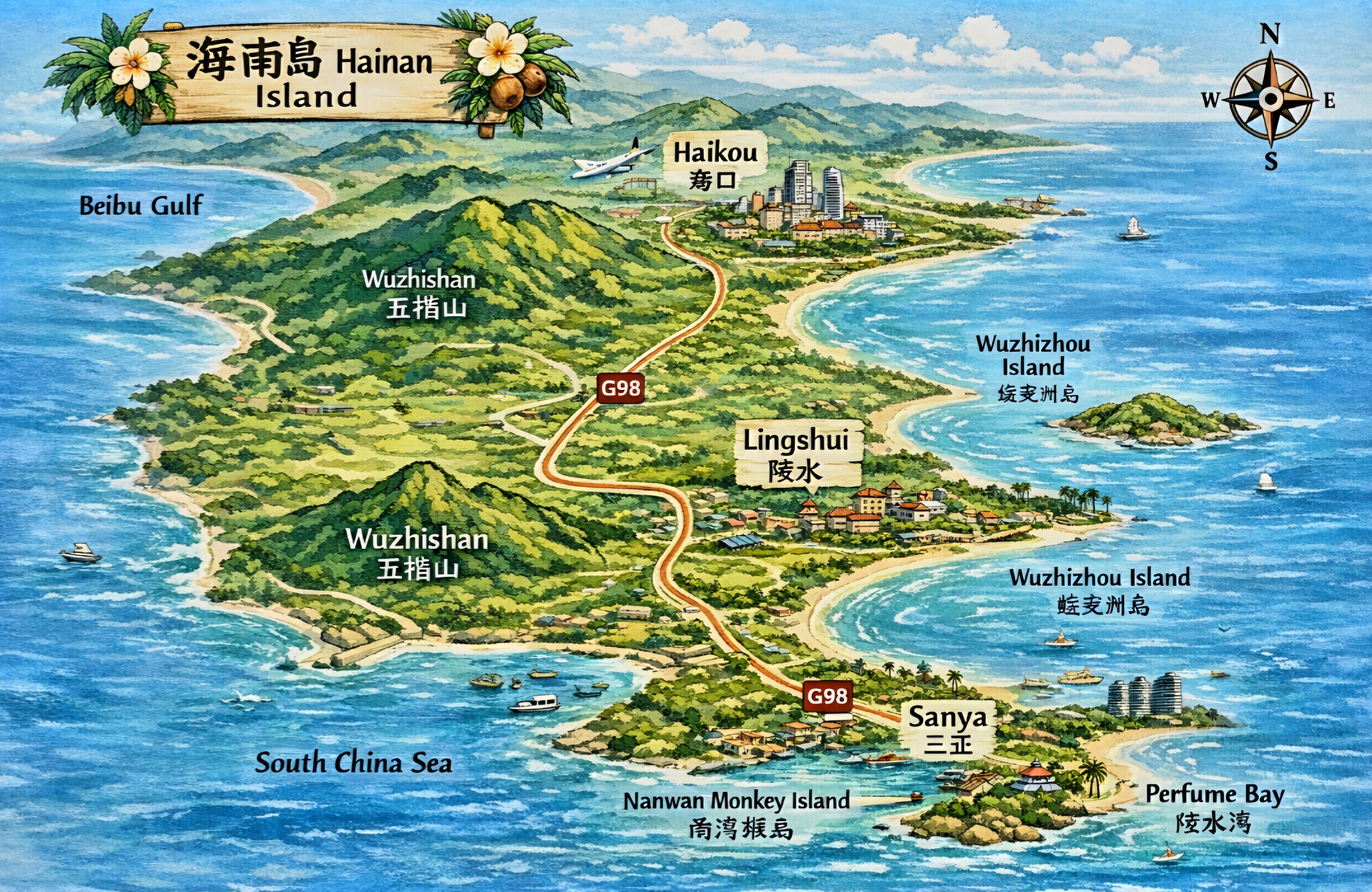 하이난의 북쪽은 아열대 남쪽은 열대우림 기후로 화산지형, 산호해변으로 이루어져 있으며 행정, 문화 중심 북쪽의 하이커우 (海口)는 치허우라오제(骑楼老 街), 영화공사, 하이난성 박물관, 뇌경(雷琼) 화산지질 공원, 오 공사등의 관광 명소가 있고 동부는 바다, 중부는 산악지역으로 리족(黎族), 먀오족등 소수 민족 마을이 있는데 빙랑구 (槟榔谷)에서는 전통 의상, 가옥, 춤, 문신 문화를 엿볼 수 있다고 합니다.