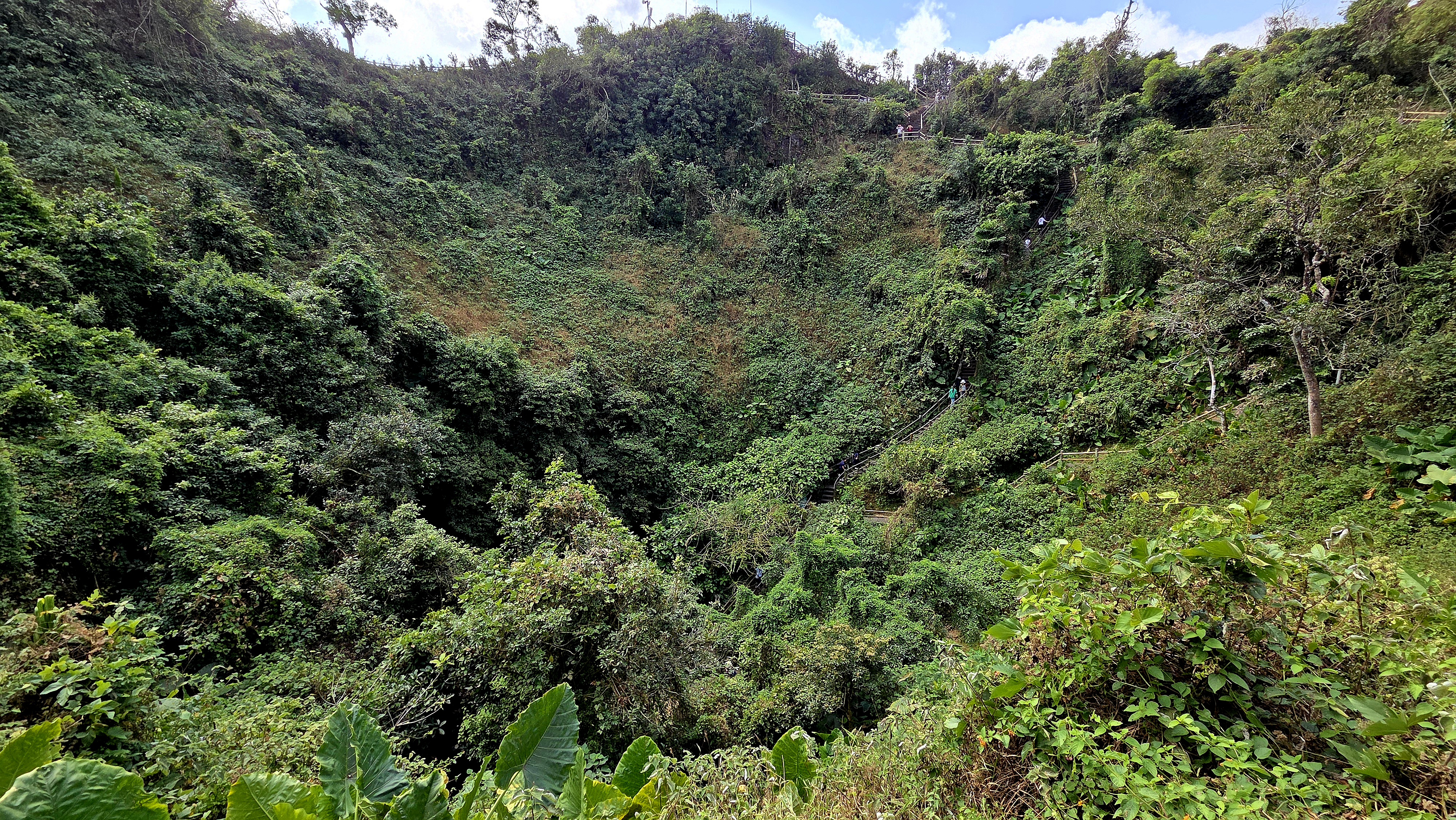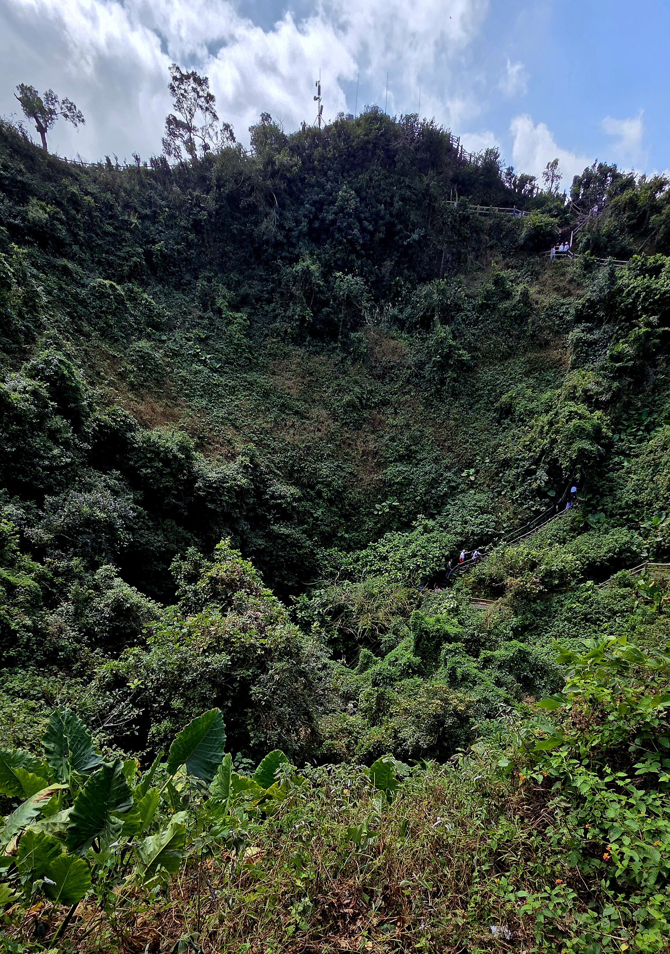 분화구 주변을 둘러본 후 거대한 가마솥처럼 생긴 풍랑 분화구 바닥까지 이어지는 트레일을 따라 걸어 내려가니 수만 명을 수용할 수 있을 만큼 거대한데 시원하고 식물이 무성하여 천연 산소 공급원 역할을 하며 화산 파편, 용암 덩어리등 화산 폭발의 흔적들을 볼 수 있습니다.
