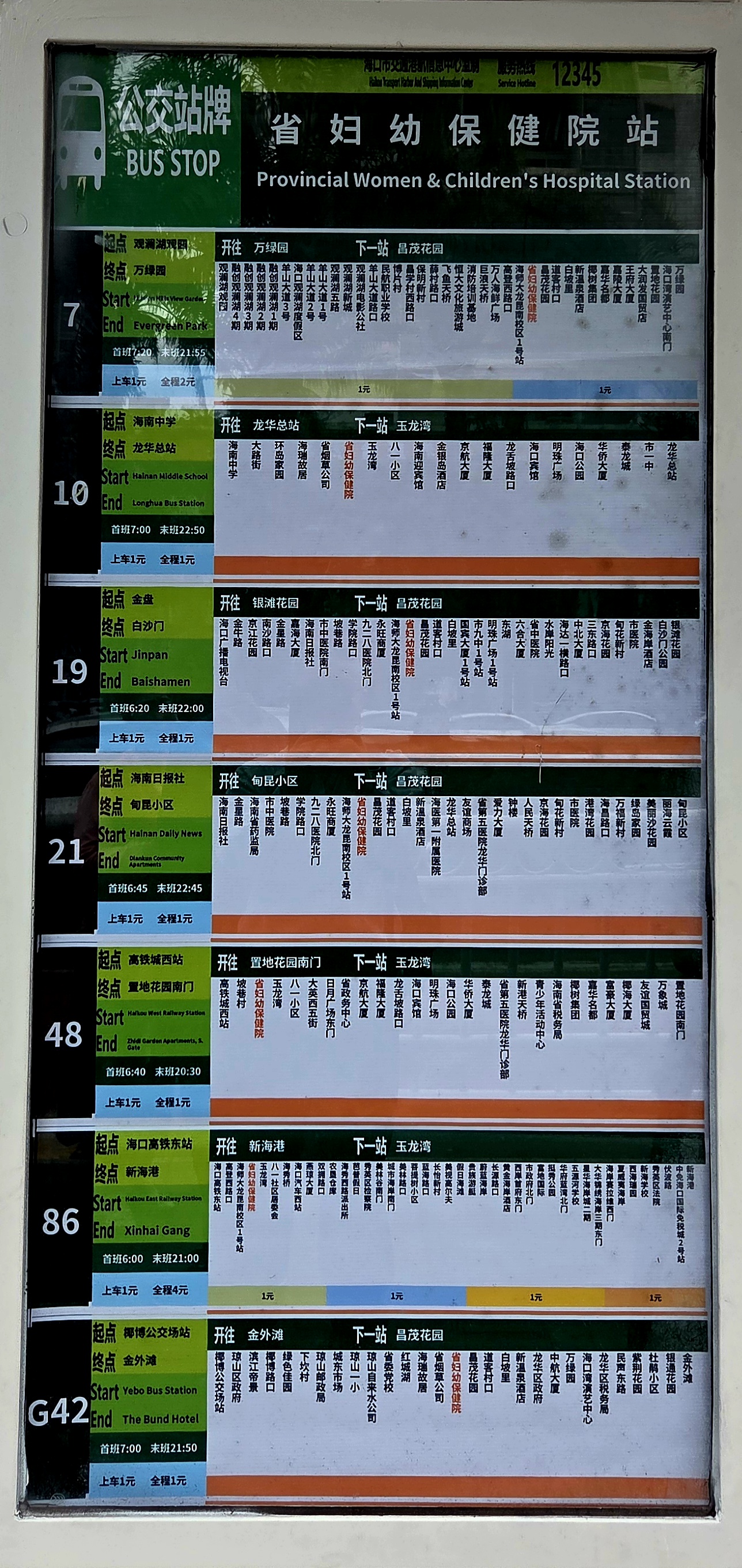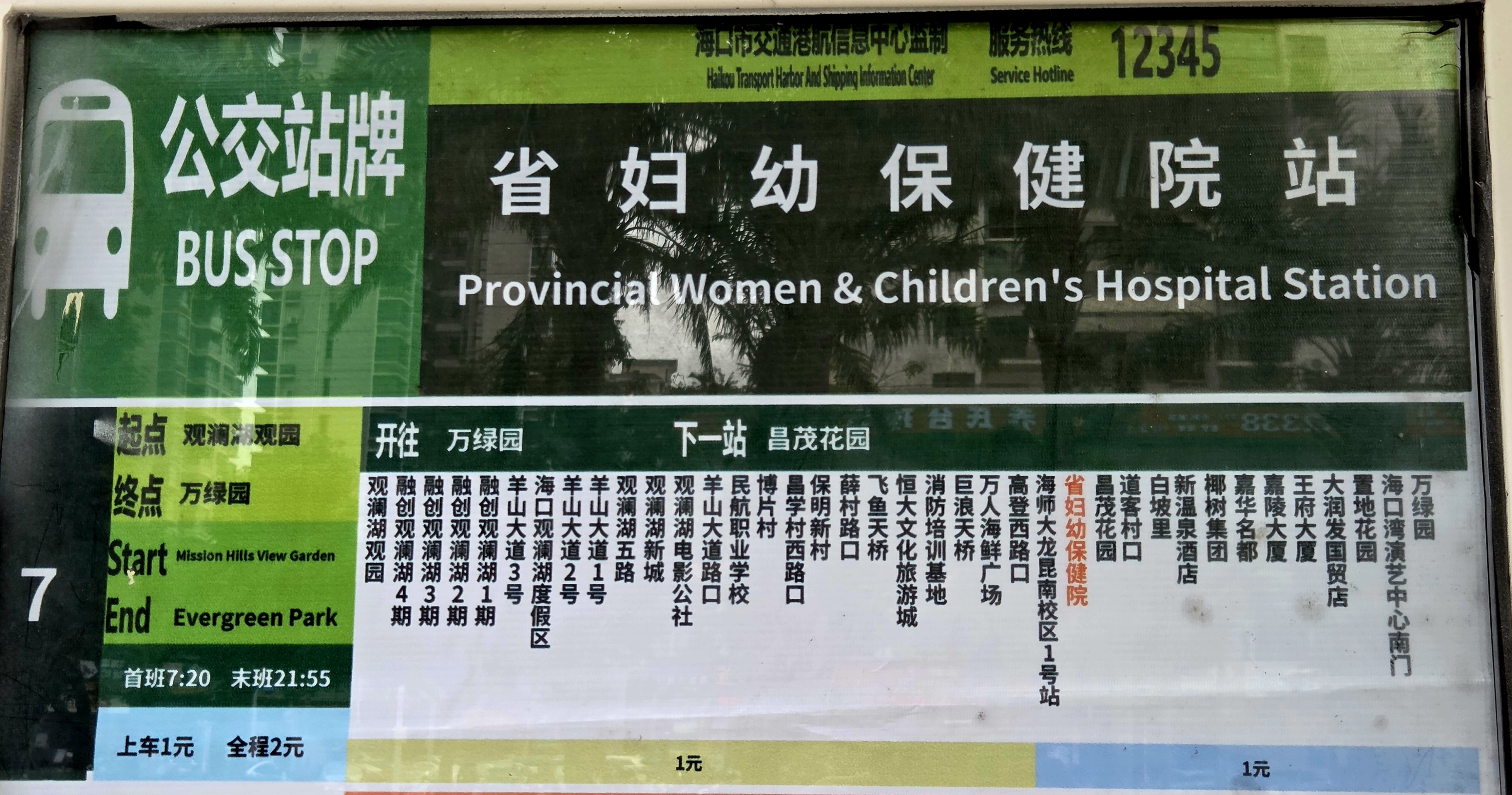 성모자 병원(省婦幼保健院站, Provincial Women & Children's Hospital Station) 정류장에서 하차합니다. 여기서 7로 공교차를 타면 미션 힐스 화이브라더스 펑샤오강 영화 타운(觀瀾湖 華誼馮小剛電影 公社, Movie Town Haikou)을 갈 수 있습니다.