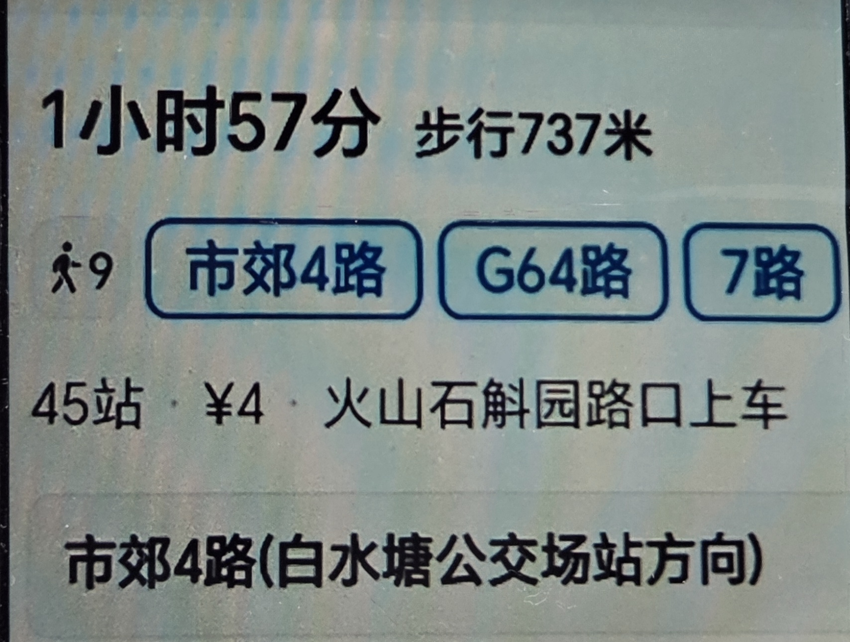 레이충 세계 지질 공원을 내려오니 화산구공원점(火山口 公园站, Volcano Port Park Station)에 시교 4로 공교차 (市郊 4路 公交車)가 대기하고 있어 바로 승차한 후 종점인 하이커우 12로 백수당차량기지 (海口 十二車隊白水塘公交站)에서 G64 공교 차로 환승하여