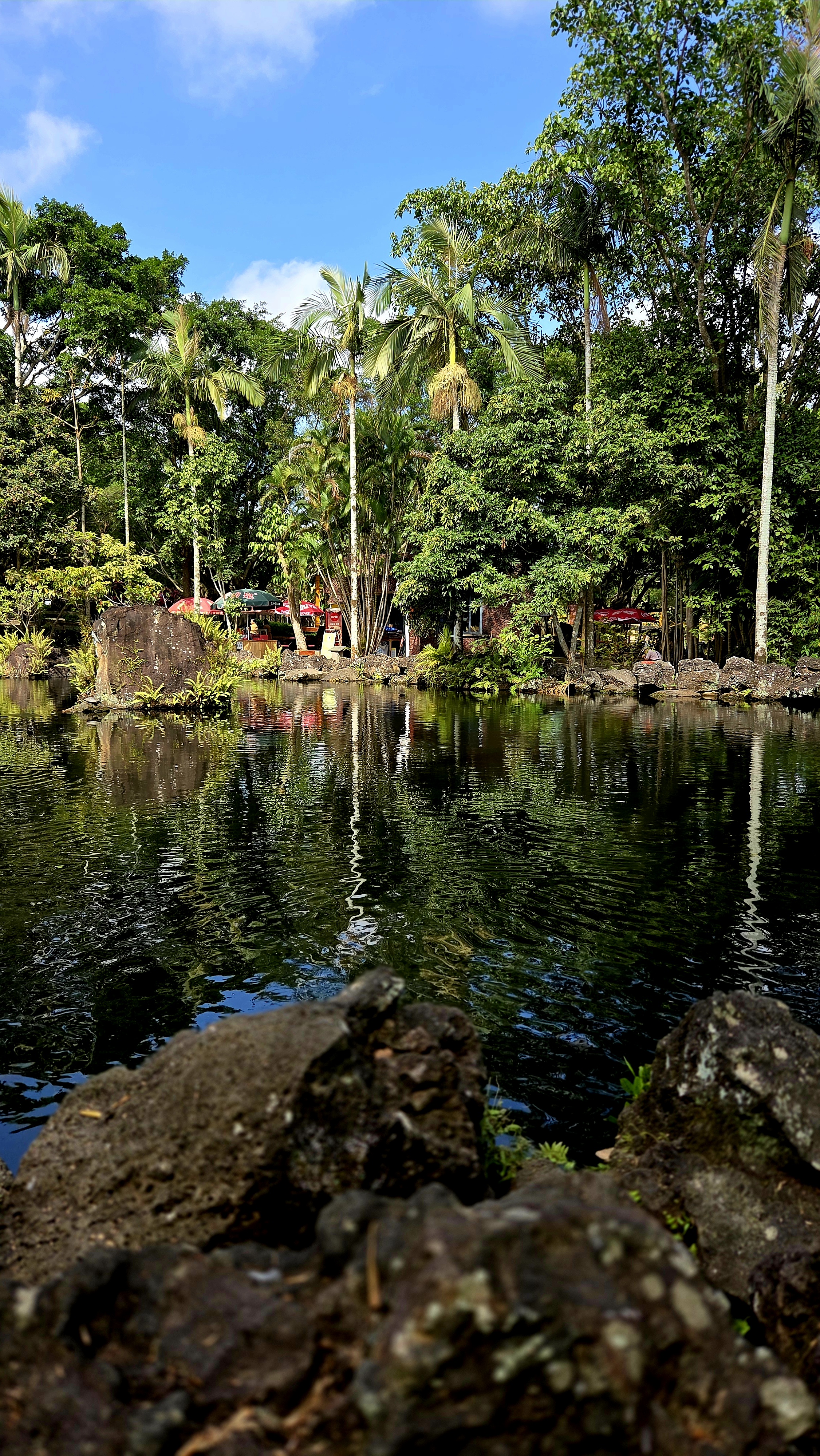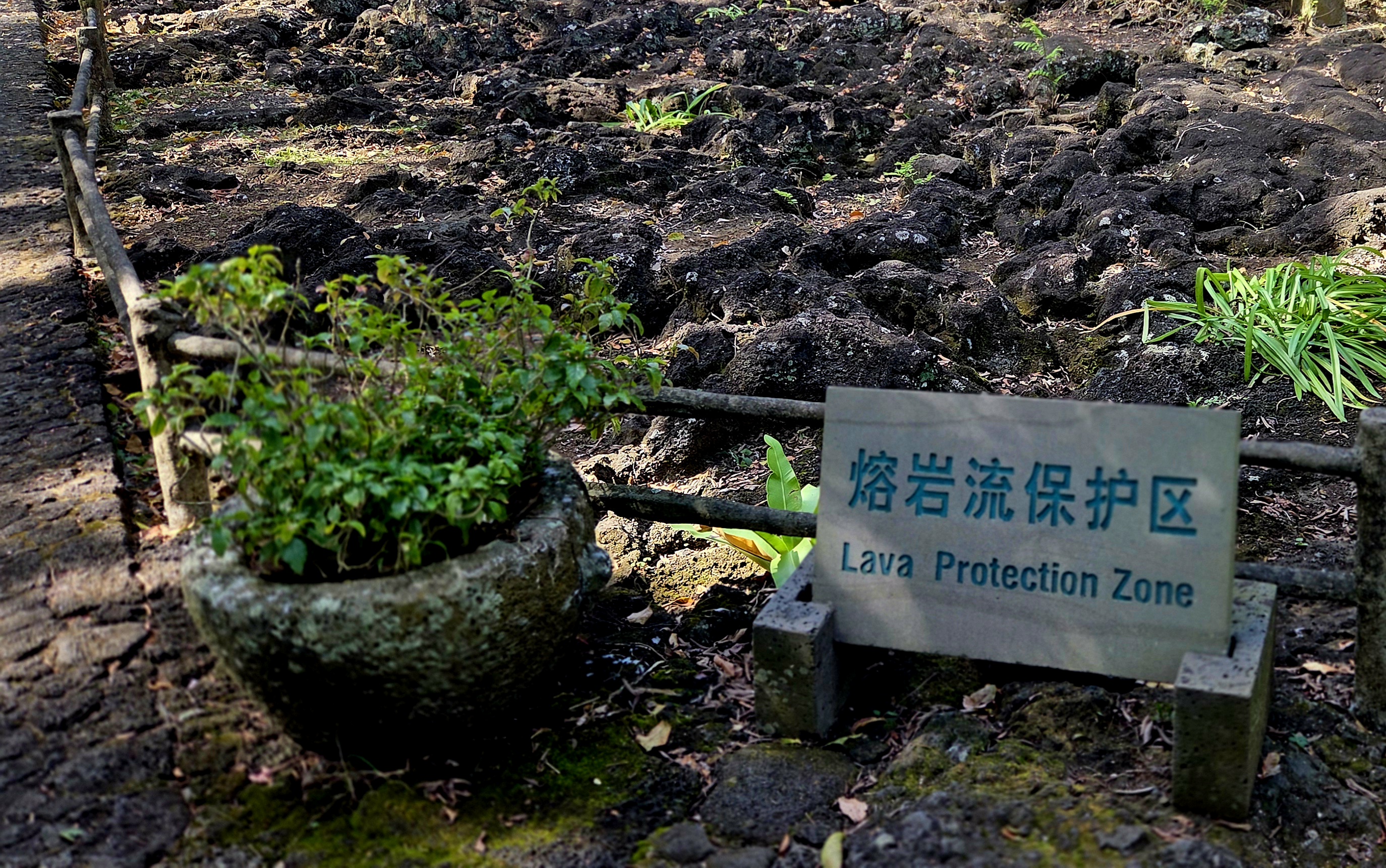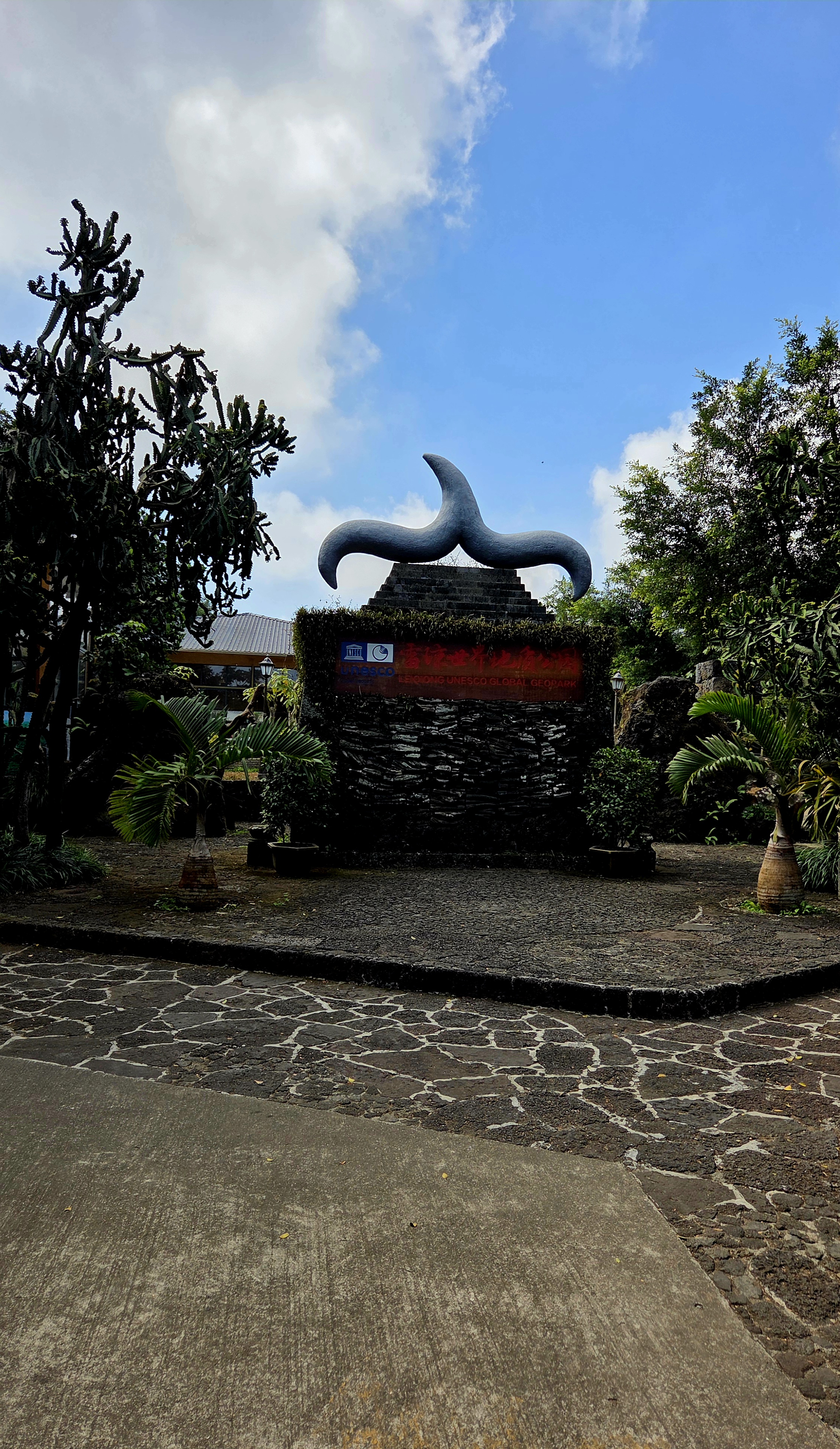 공원으로 들어서자 거무튀튀한 현무암에 용암처럼 붉은색으로 화산구(火山口)라고 쓰인 표지석이 나를 맞이하고 이곳이 UNESCO세계지질공원임을 알려줍니다. 산책로를 따라 걷다 보면 울창한 열대 식물과 현무암 용암류등 화산 지형을 만날 수 있고 화산석으로 만든 마을 문, 돌로 만든 맷돌, 돌그릇, 돌대, 돌탁자, 사탕수수 가공 도구등 2천 년 전에 만들어진 다양한 현무암 유물을 전시하는 화산 석기 문화 공원이 나옵니다.