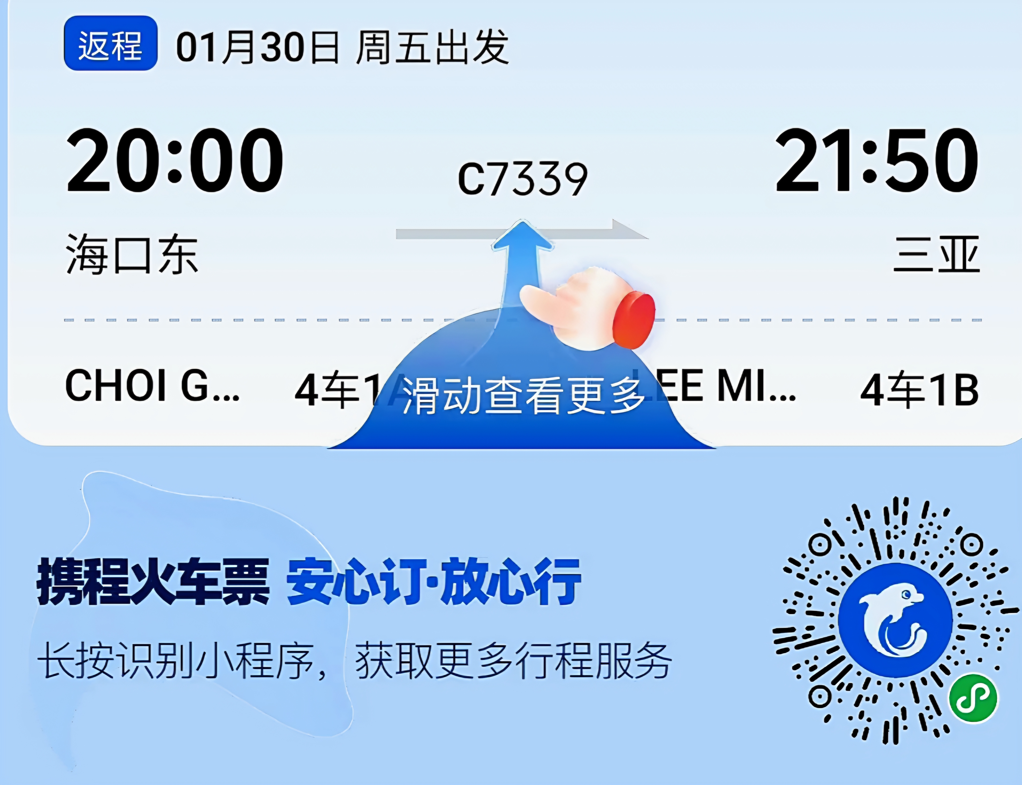 싼야에서 하이커우까지 가는 가장 빠른 방법. 약 2시간이 소요되며 요금은 119위안/인 (2등석)