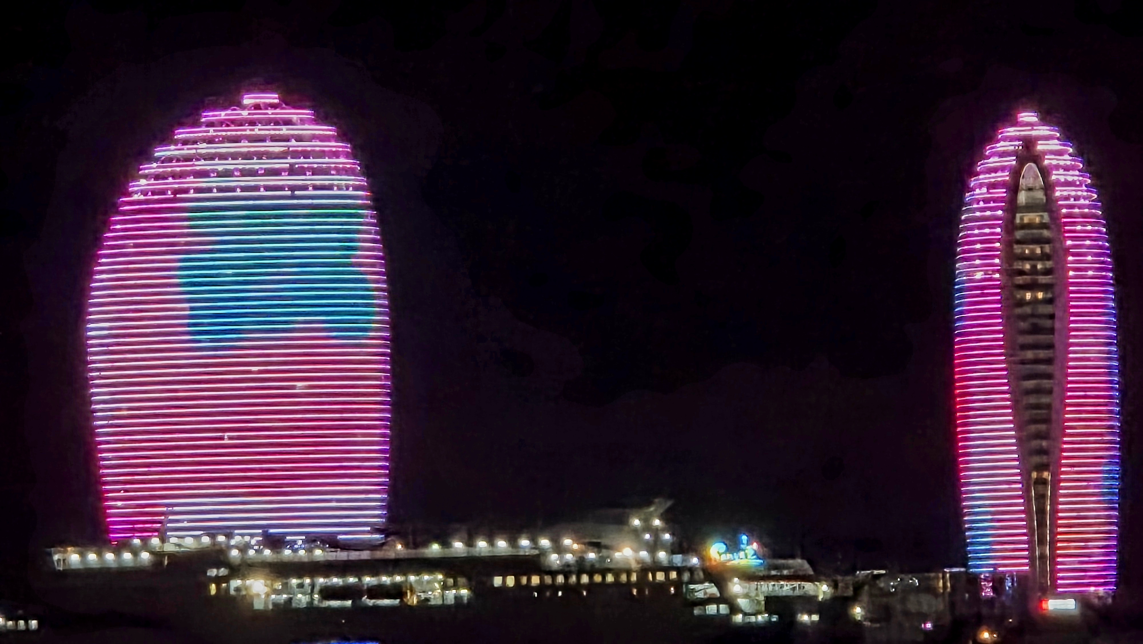 럭셔리 호텔,크루즈 항구, 현대적인 건축물로 구성된 봉황도는 국제적인 최고급 럭셔리 리조트 단지로 동양의 두바이로 불리며 해가 지면 거대한 붉은 꽃으로 변신하여 수많은 사람들을 황홀지경으로 만듭니다.