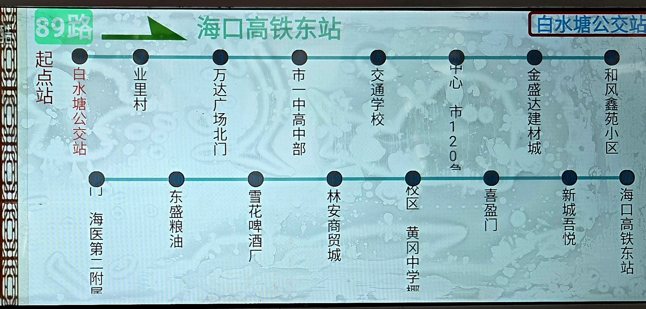 하이커우 투어 첫 목적지인 레이충세계지질공원(雷琼世界地质公园, Loiqiong UNESCO Global Geopark:No.89 Fengjing Rd., Shishan Town, Shuying District, Haikou City)으로 가기 위해 동점공교차 버스정류장 (东站公交車中心)에서 89路 공교차를 타고 백수당공교점 (白水塘公交站)으로 가서 시교 4로(市郊4路) 공교차를 타니 레이충 세계 지질 공원 앞 화산구공원점(火山口 公园站, Volcano Port Park Station)에 도착합니다.