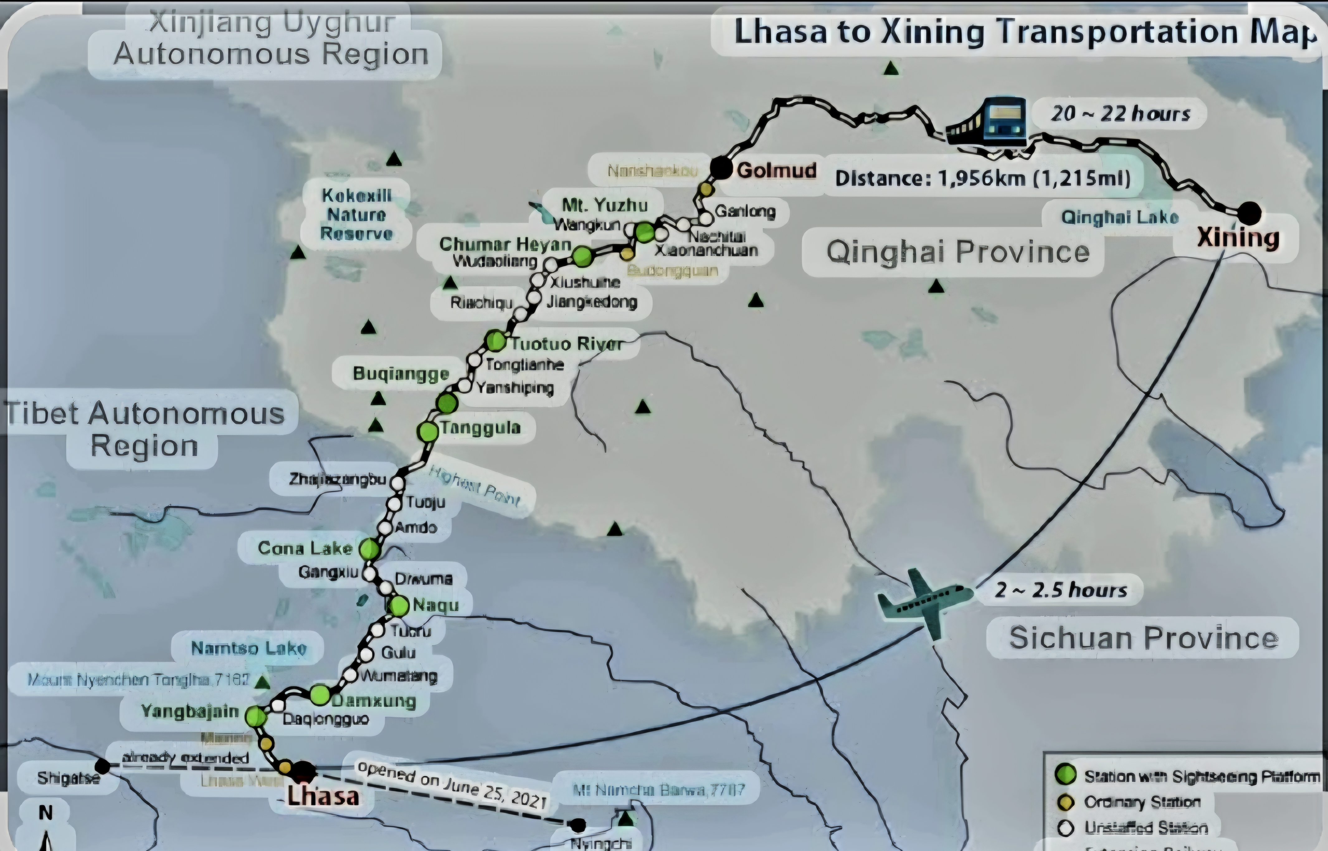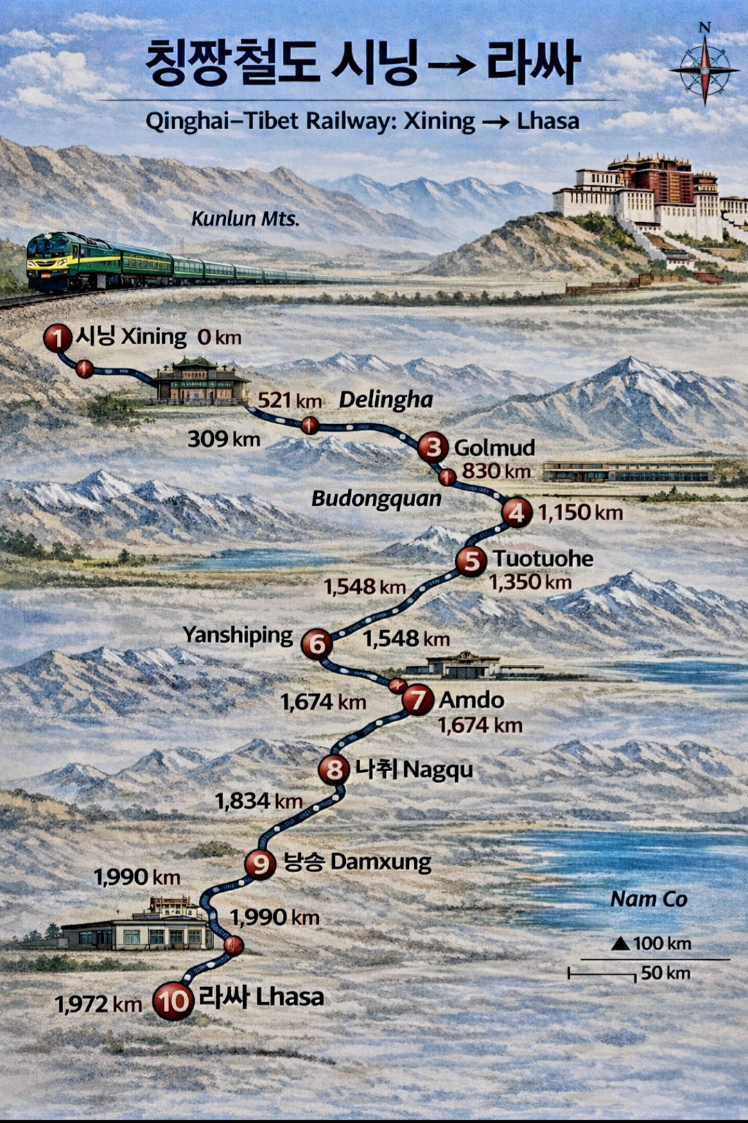 칭짱철도는 시닝역과(2,260m) <-20~23시간->라싸역(3,650m)을 연결하며 탕구라역(5,072m)은 세계에서 가장 높은 곳에 위치하고 있는 역입니다.